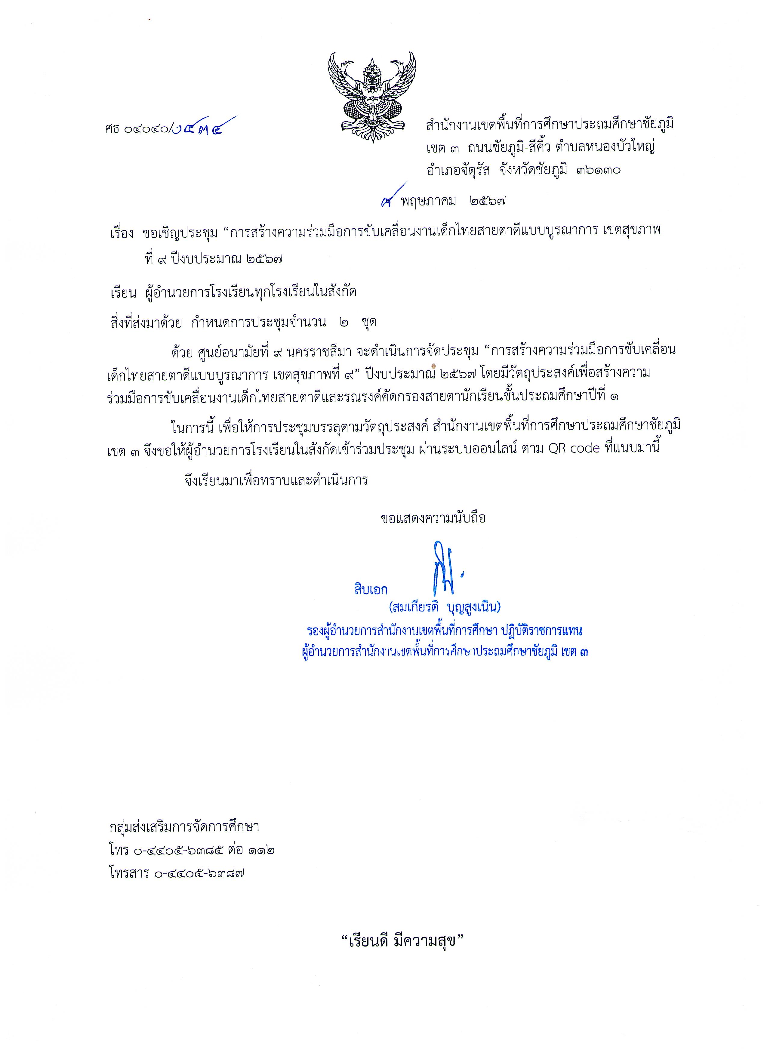 เรื่อง : ขอเชิญประชุม "การสร้างความร่วมมือการขับเคลื่อนงานเด็กไทยสายตาดีแบบบูรณาการ เขตสุขภาพที่ ๙ ปีงบประมาณ ๒๕๖๗ [ |