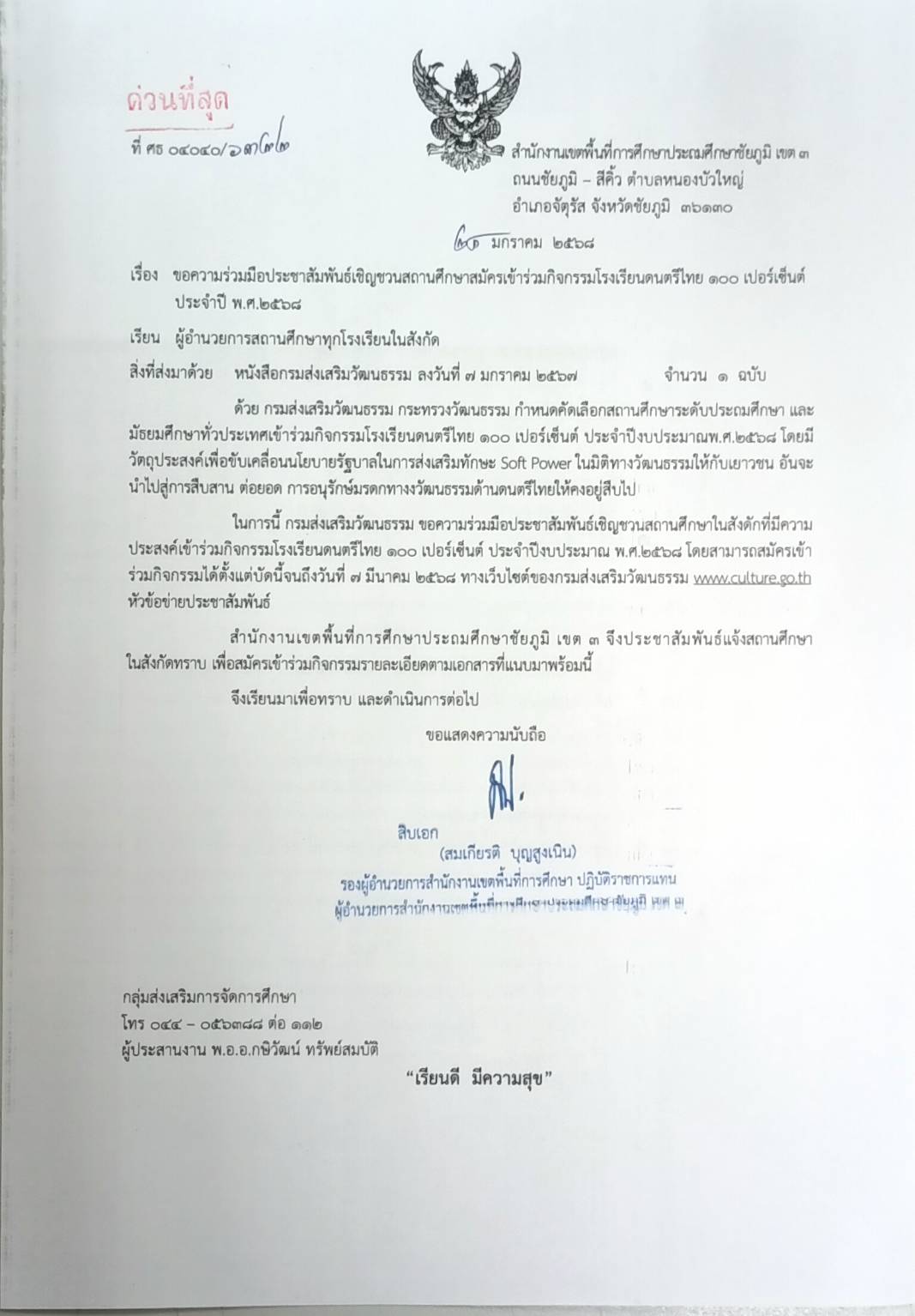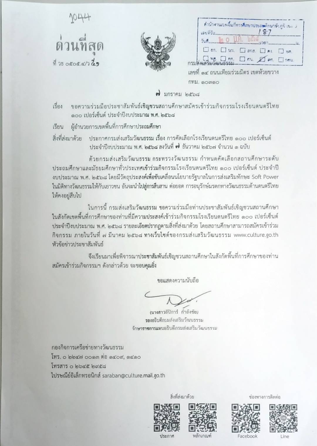 เรื่อง : ขอความร่วมมือประชาสัมพันธ์เชิญชวนสถานศึกษาสมัครเข้าร่วมกิจกรรมโรงเรียนดนตรีไทย ๑๐๐ เปอร์เซ็นต์ ประจำปี พ.ศ.๒๕๖๘ [ |